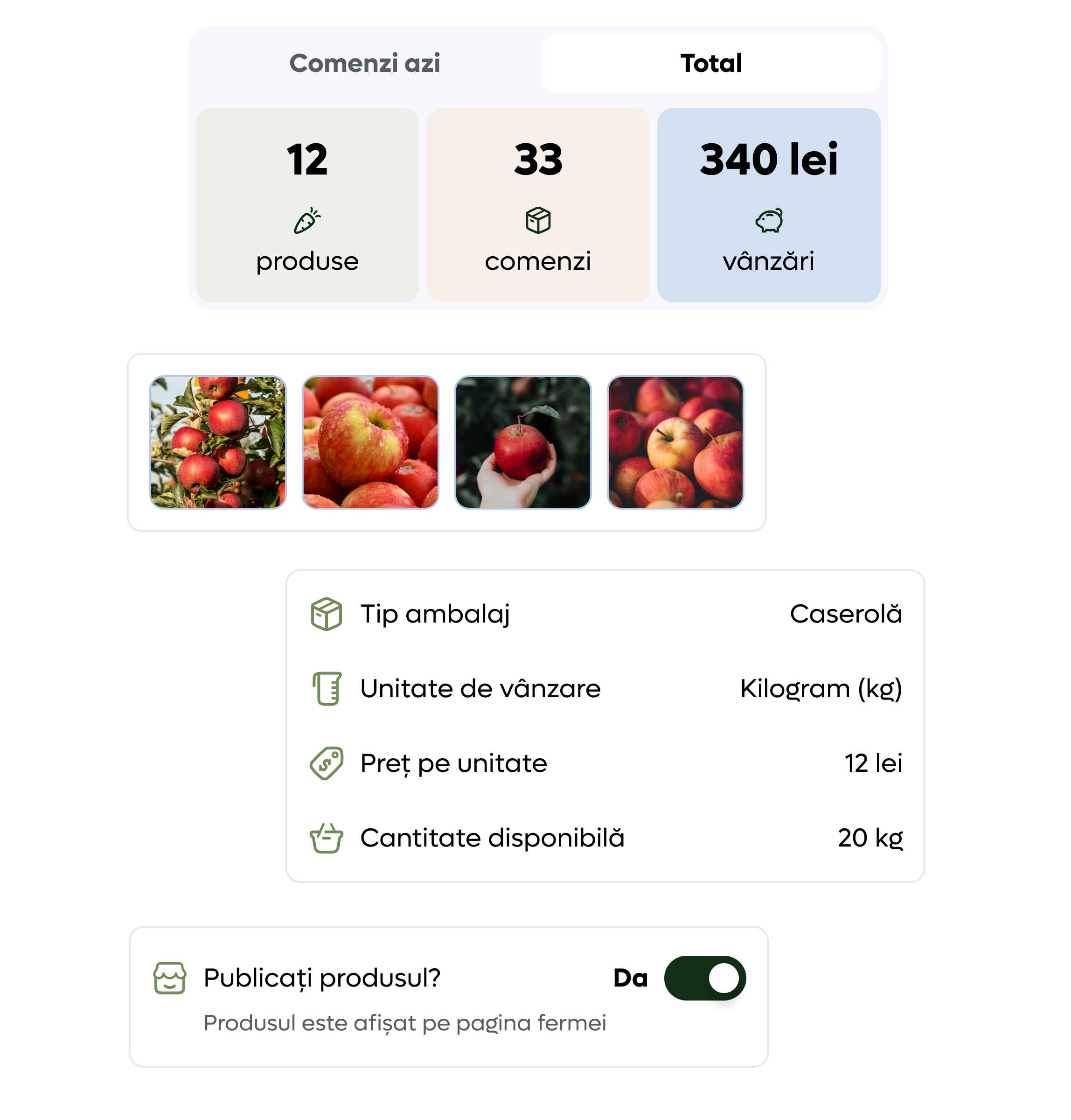 Adaugă-ți ferma, publică produsele tale și gestionează comenzile cu ușurință, dintr-un singur loc.